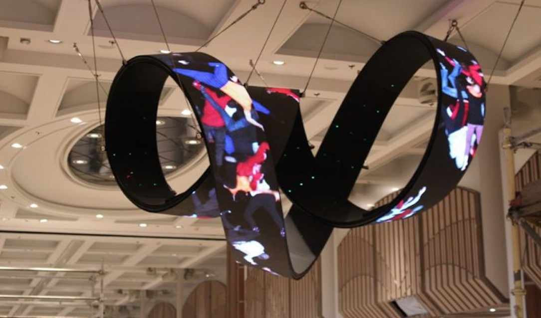 L'écran flexible est fabriqué par des modules LED doux.t peut obtenir une forme créative, comme cylindre, concave, convexe, forme d'onde, bande de Mobius, etc.